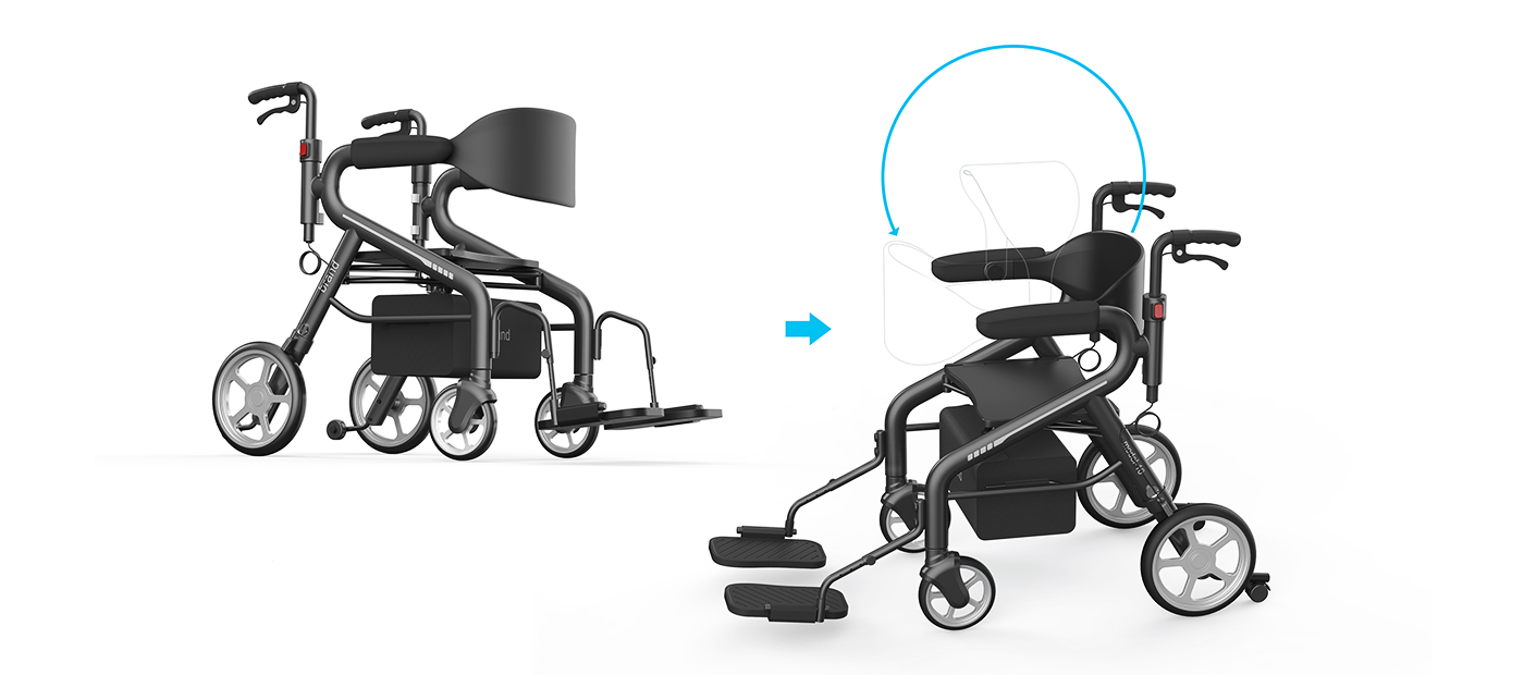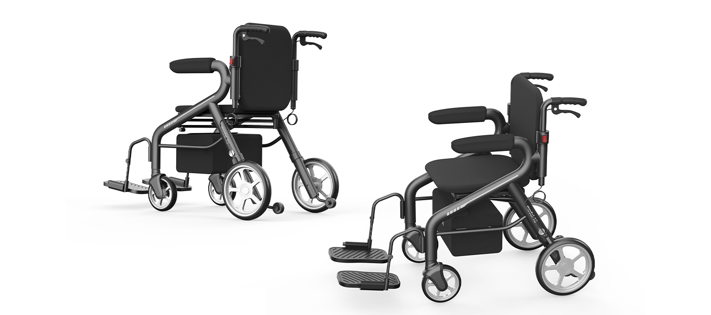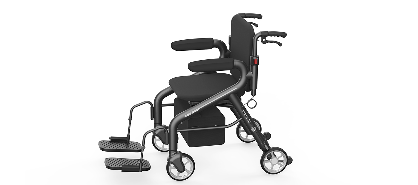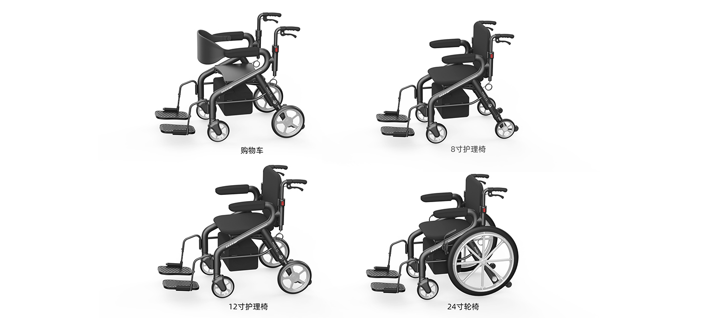 模块化辅助设备,能够通过不同模块的替换安装实现轮椅,助行器,购物车等多种不同功能,未来可通过增加电驱动车轮实现电动轮椅功能。