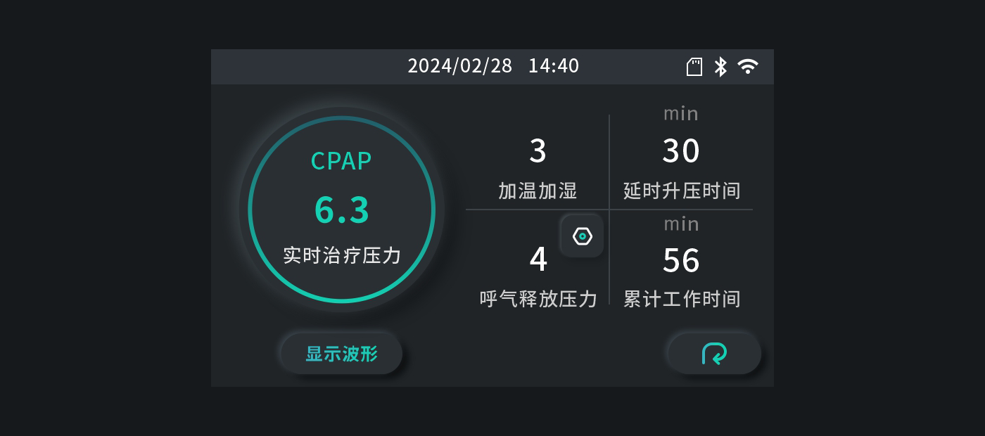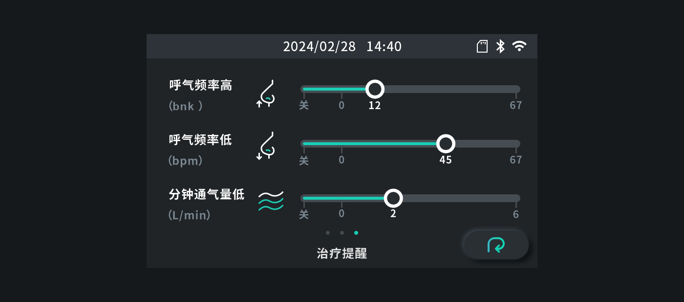采用轻拟物风格设计的双水平呼吸机操作界面,可通过手势操作调节各项参数。