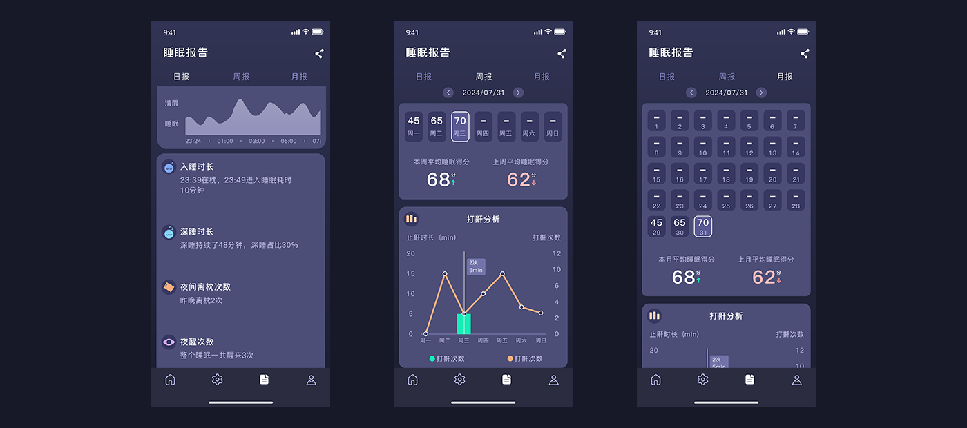 AI助眠枕的手机端小程序设计。通过图文并茂的交互界面,更直观的显示各项数据。